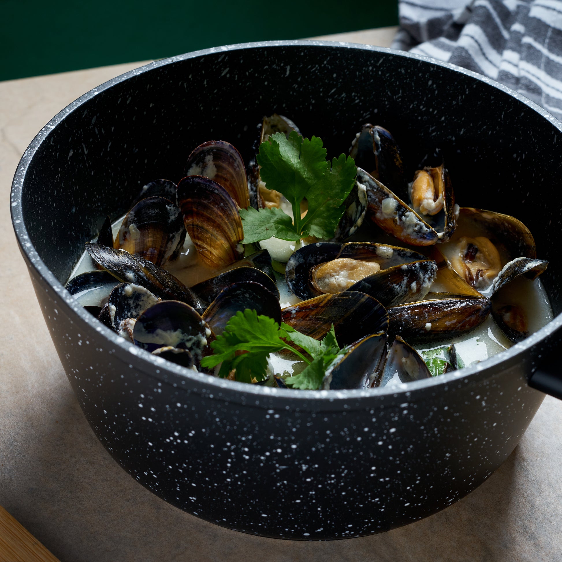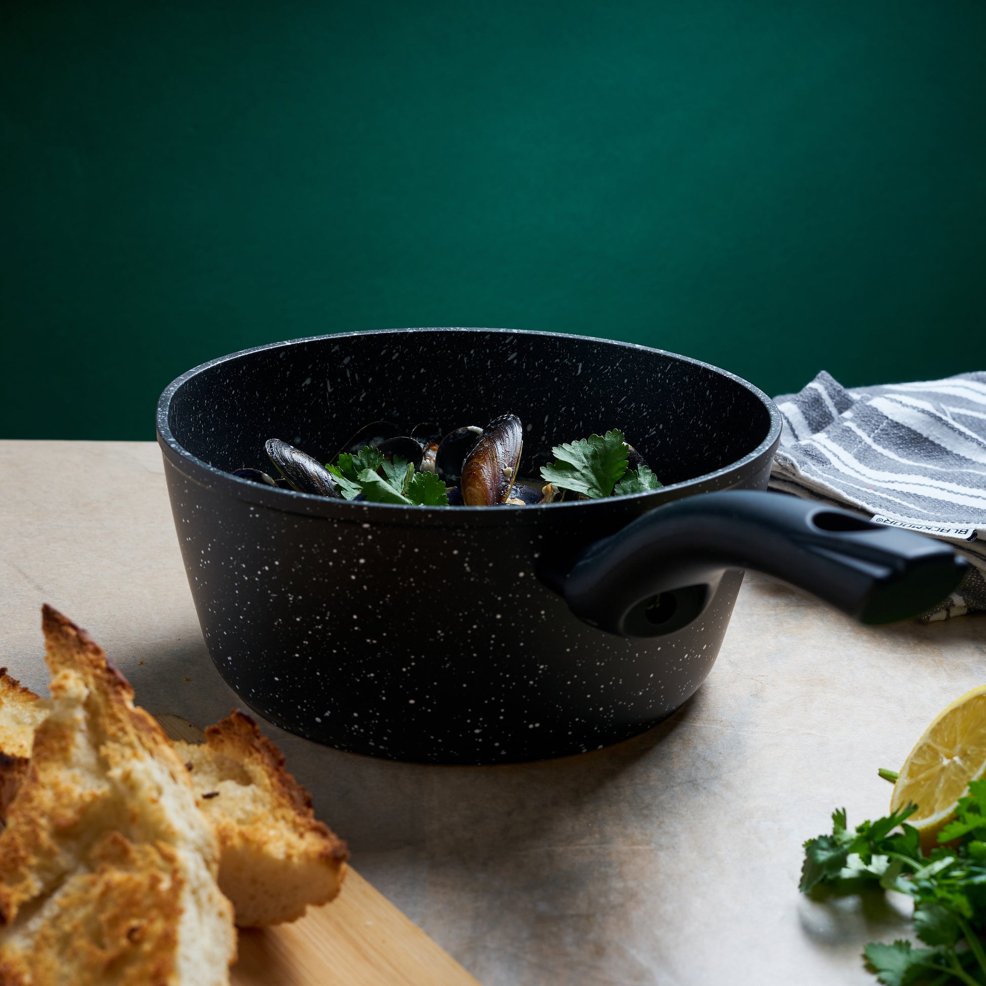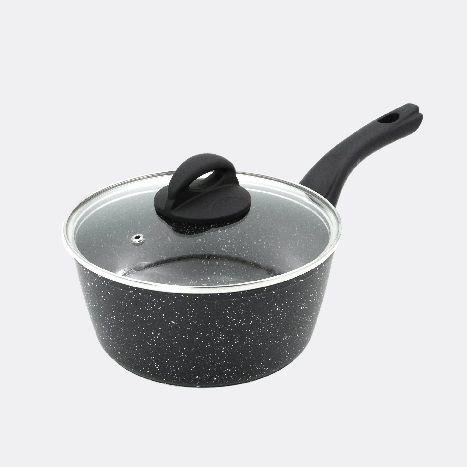 The saucepan features a forged aluminium base, and also features a hybrid stone coating, that allows the heat to conduct faster and retain the heat throughout the cooking process.