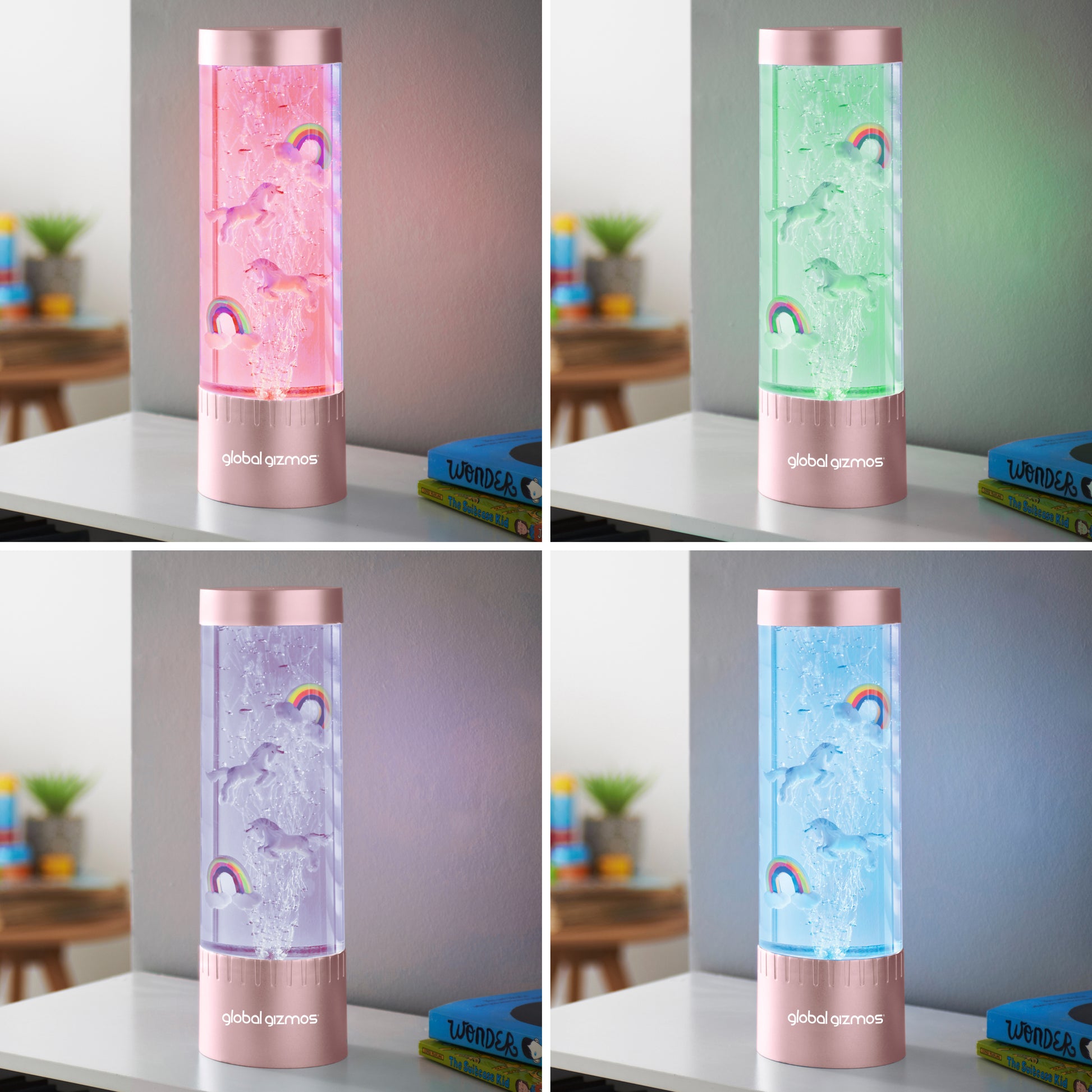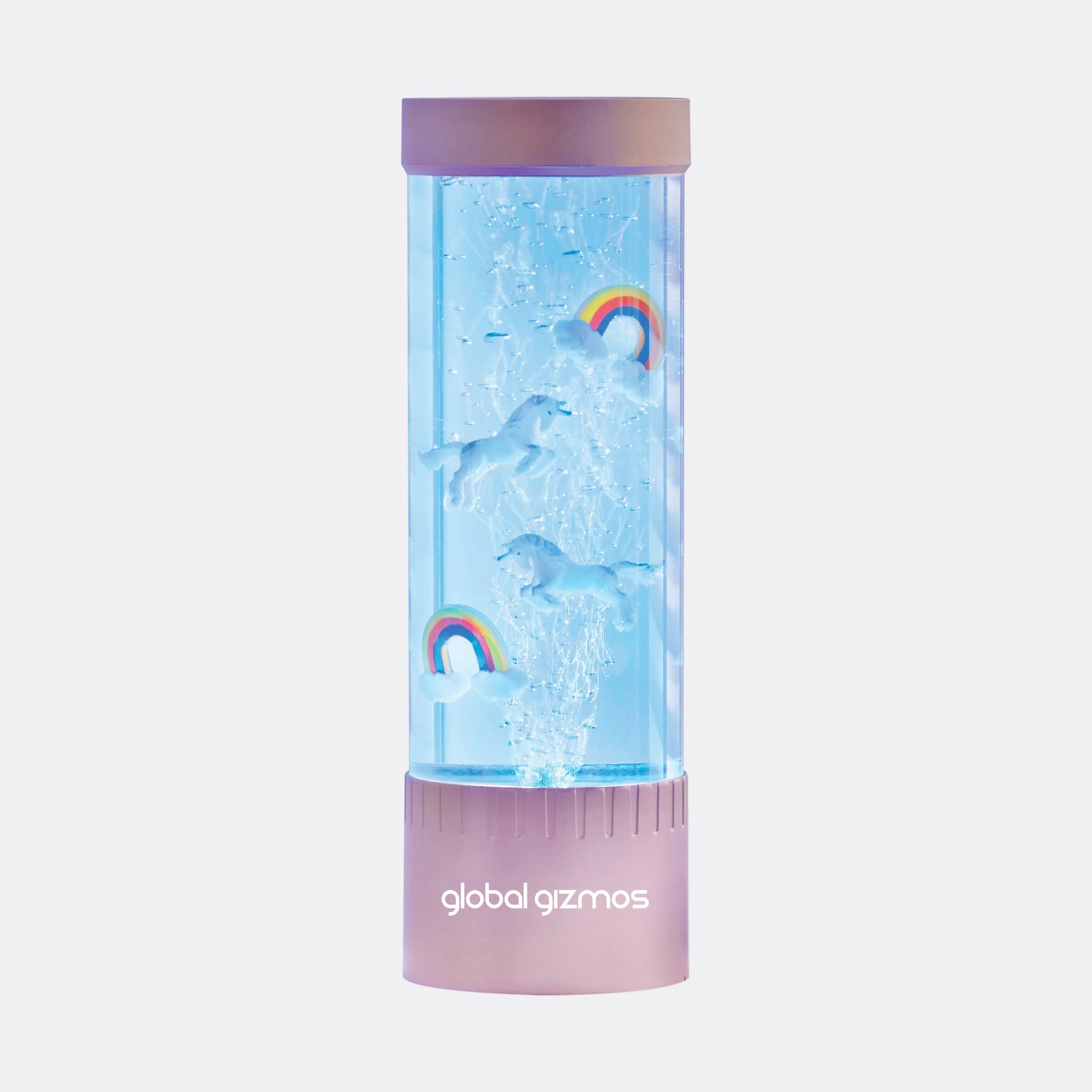 This rose gold, 32cm colour changing bubble lamp with unicorns and rainbows is a fantastic novelty mood light that creates an amazing sensory experience for any room in your house, school, or workplace.