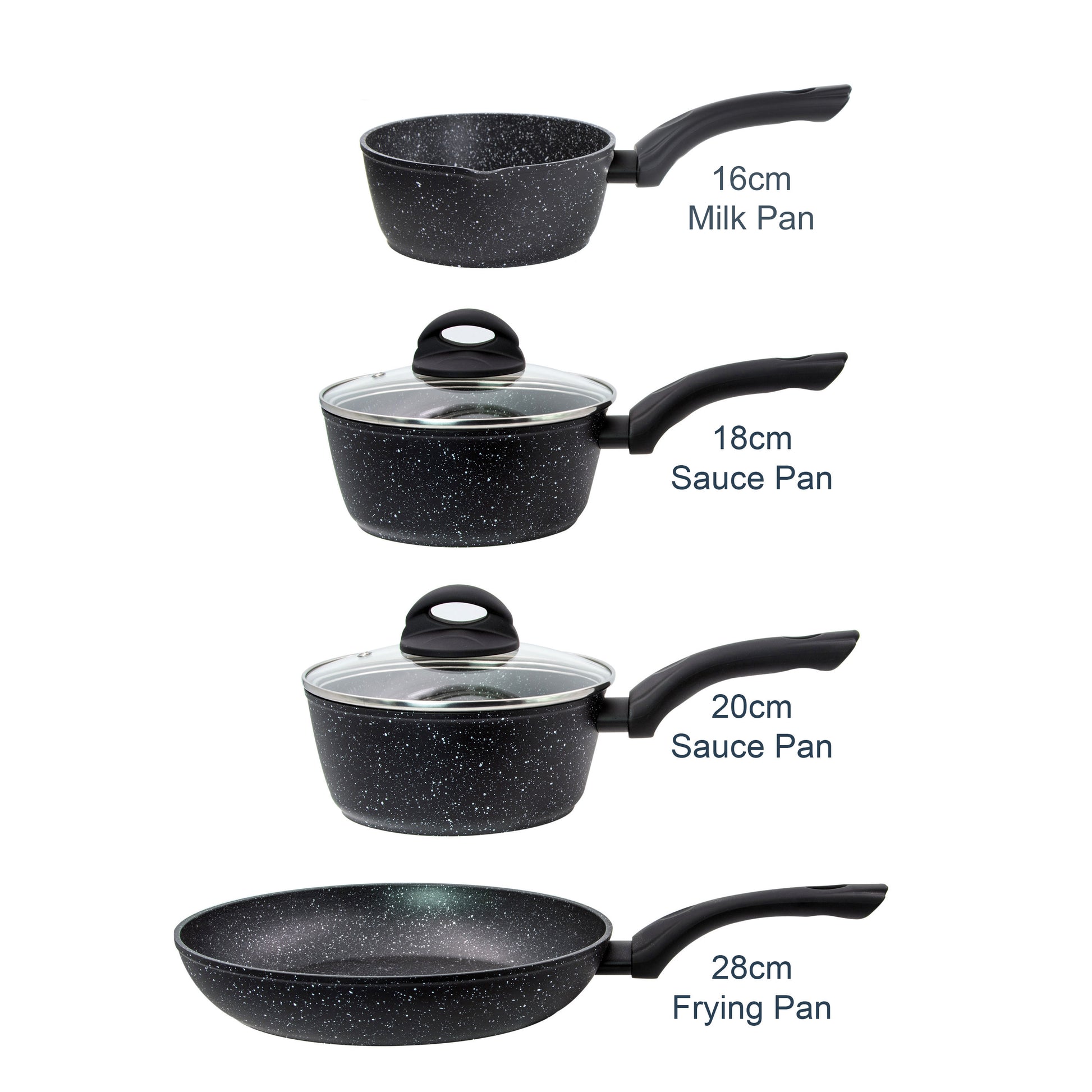 The pan set features a 16cm milk pan, ideal for boiling milk and making sauces, alongside both an 18cm and 20cm saucepan, ideal for cooking pasta, rice and boiling vegetables, and a 28cm frying pan, large enough to fry plenty of meats and vegetables.