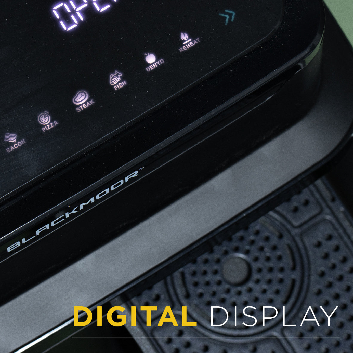 This air fryer is equipped with a user-friendly digital display and 10 pre-programmed settings, including Fries, Bake, Chicken, Shrimp, Bacon, Pizza, Steak, Fish, Dehydrate, and Reheat. The non-stick coated baskets ensure easy clean-up, while the 1-meter power cable provides added placement flexibility on your countertop for hassle-free cooking.